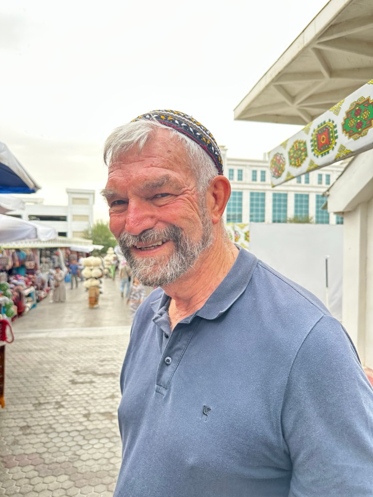 Bahtiyar kicked off our afternoon with a whirl through the city’s contrasts. First stop: a sleek modern shopping mall, all polished glass and polished locals. Then we plunged into the lively Russian Market, a treasure trove of Turkmen culture—hand-knotted rugs in deep jewel tones, fragrant stacks of spices and dried fruit, garments spun from soft camel hair, and quirky woollen hats that begged to be tried on. Of course Frank had to try one on!