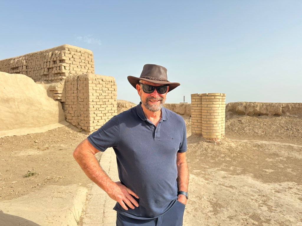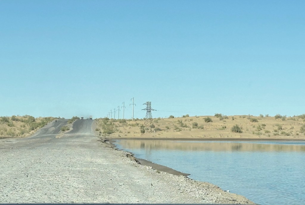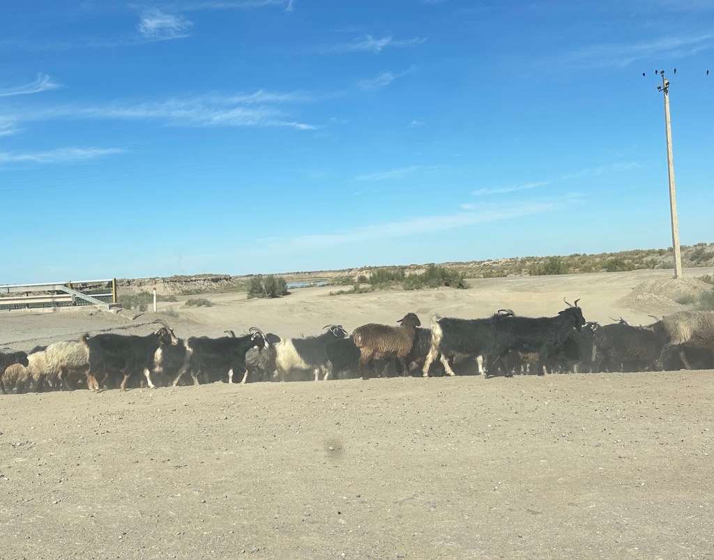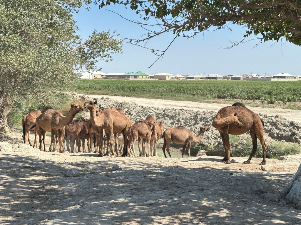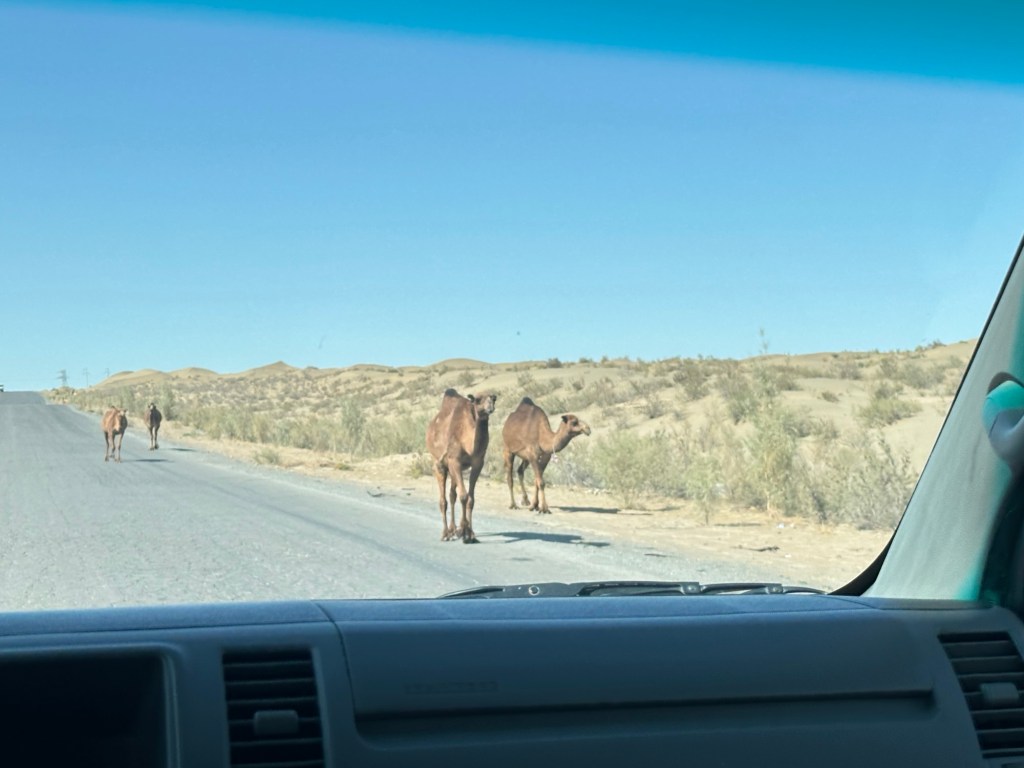 Once we landed in Mary, two drivers with cars picked us up to drive to the Karakum Desert to Margush (110km away). Well that was an interesting experience- we didn’t realise we had signed up for the Dakar car rally. It could have been a nice scenic drive through the countryside enjoying the rural countryside, instead it was two hours of dodging cars and potholes, and trying to stay upright! We drove alongside many cotton farms, and cows and camels grazing.