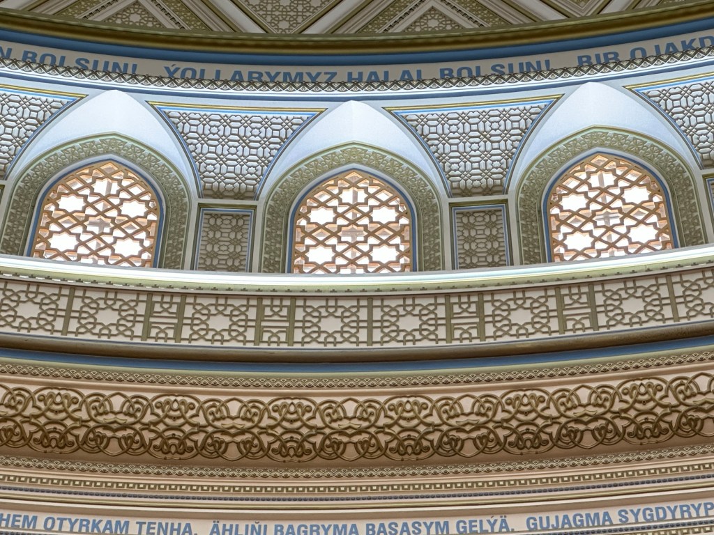 Next, the stunning Turkmenbashi Mosque-Mausoleum, one of the biggest mosques in Central Asia. Absolutely breathtaking! The mosque was built in 2002-2004 on the initiative of Turkmenbashi and named after him. The mosque itself is a one-domed building, surrounded by 4 minarets. The height of the mosque is 55 metres, and that of the minarets is 91 m to symbolize the year 1991 – when Turkmenistan gained independence. The tiles and rugs are amazing. 10000 people can worship there at one time. Next to the mosque, is the Turkmenbashi Mausoleum – more modest in décor and size. Turkmenbashi himself is buried in the central sarcophagus, alongside four family members.