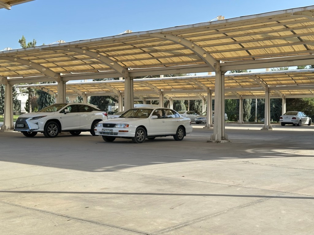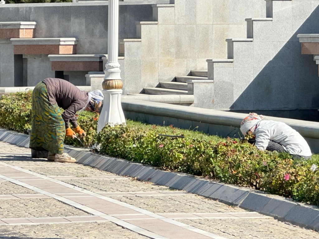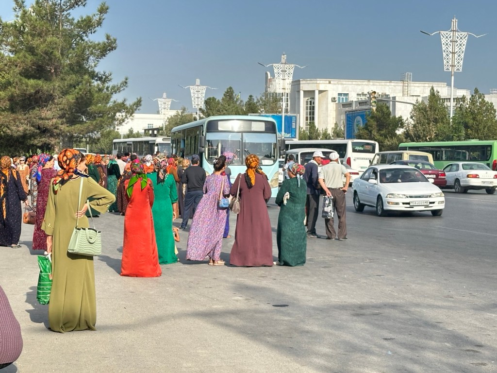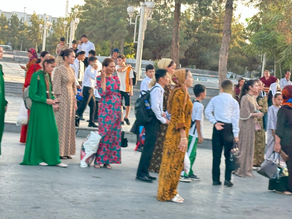All the cars in Ashgabat are white, with an occasional silver or light gold vehicle. Even though Ashgabat is in a desert, there are tree lined streets and manicured parks every few kilometres. Population is 1.1 million. The women wear elegant long dresses, the married ones wear headscarves. They look just gorgeous!