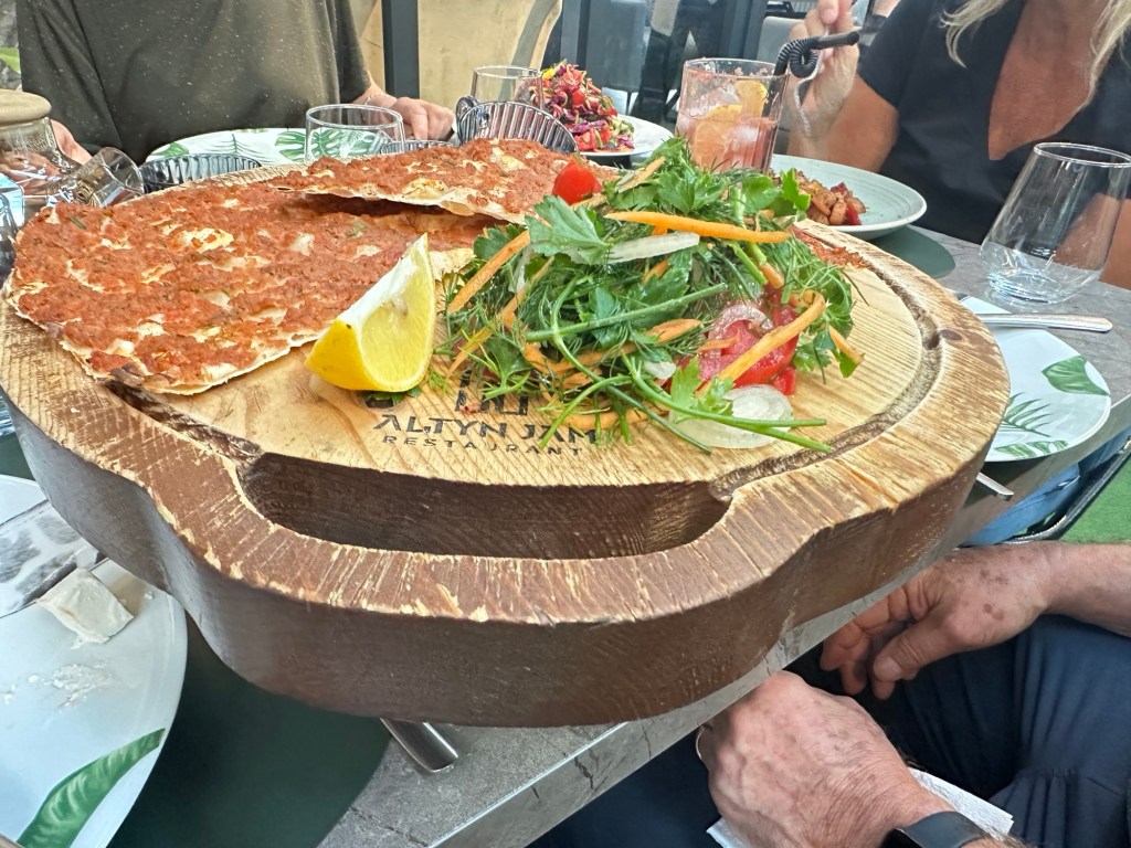 Next a late lunch at 4pm, in an exquisite restaurant – Bahtiyar description. And he was correct! The food was sensational. We shared baked eggplant stuffed with mince, a mixed grill and salad, and lahmajuhn – a flat bread covered with a tomato sauce, salad and sprinkled with lemon juice. All were delicious – beautiful flavours. We couldn’t eat it all. Even Frank faltered. And all that for $20 for both of us!